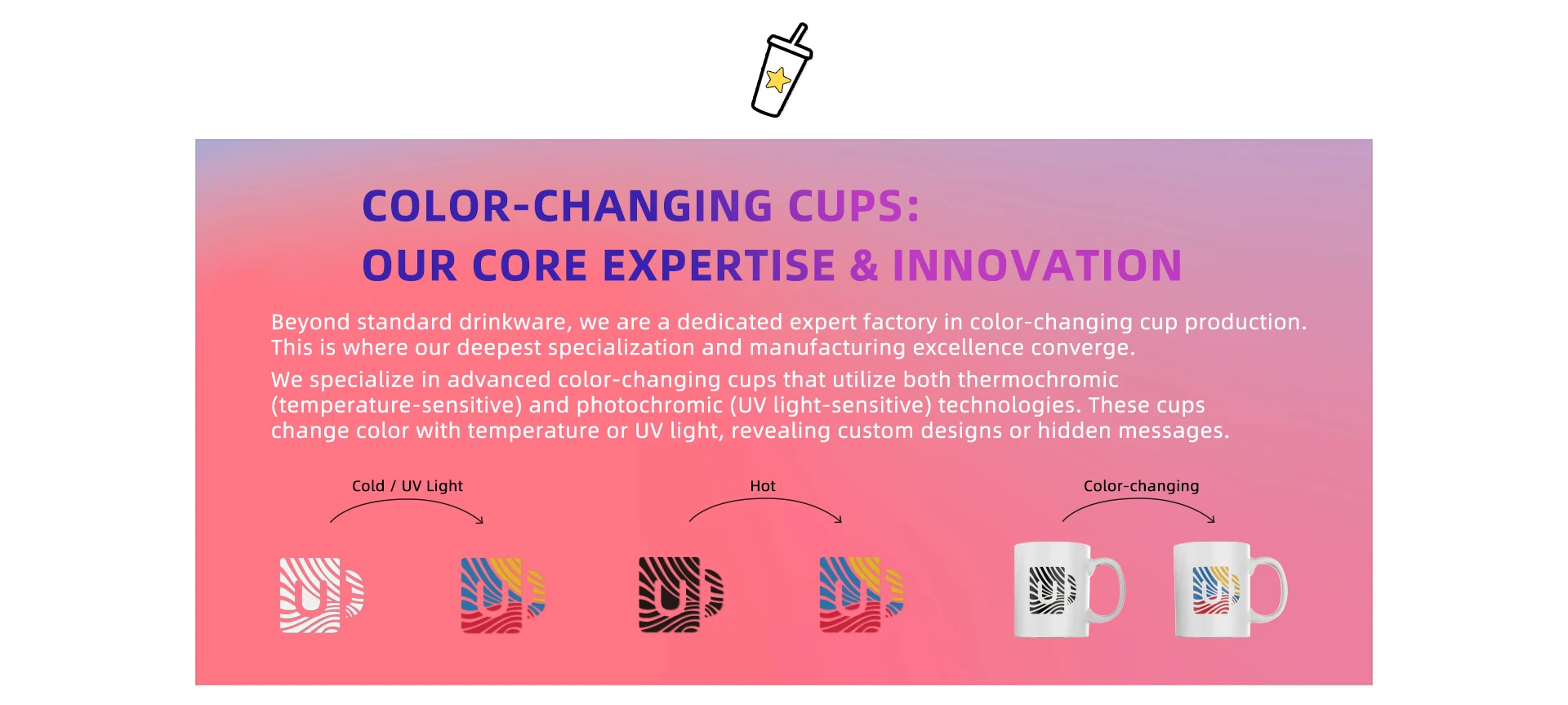 Основные продукты:Керамическая кружка, меняющая цвет, меняющая цвет пластиковая чашка, меняющая цвет алюминиевая бутылка, меняющая цвет бутылка из нержавеющей стали, меняющая цвет стеклянная чашка